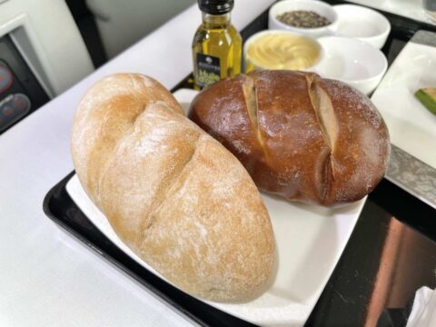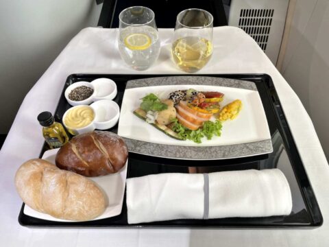 機内食は「洋食」を選択しましたが、先ずは前菜とパンのセット。長距離路線と違ってテーブルセッティングではなく、トレーに乗せられての配膳です。