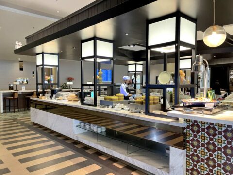 だだっ広いワンフロアに様々なタイプのソファーシートがあり、中央には多数のコックが腕を振るうビュッフェカウンターがズラリ!