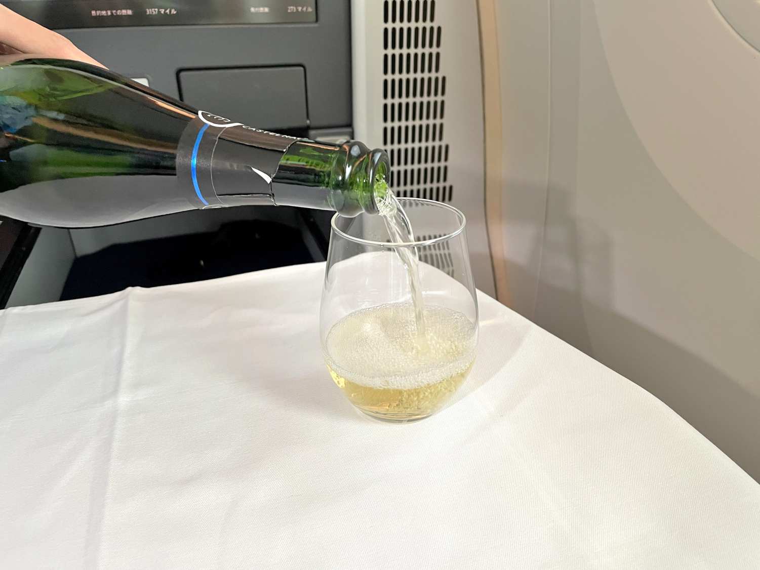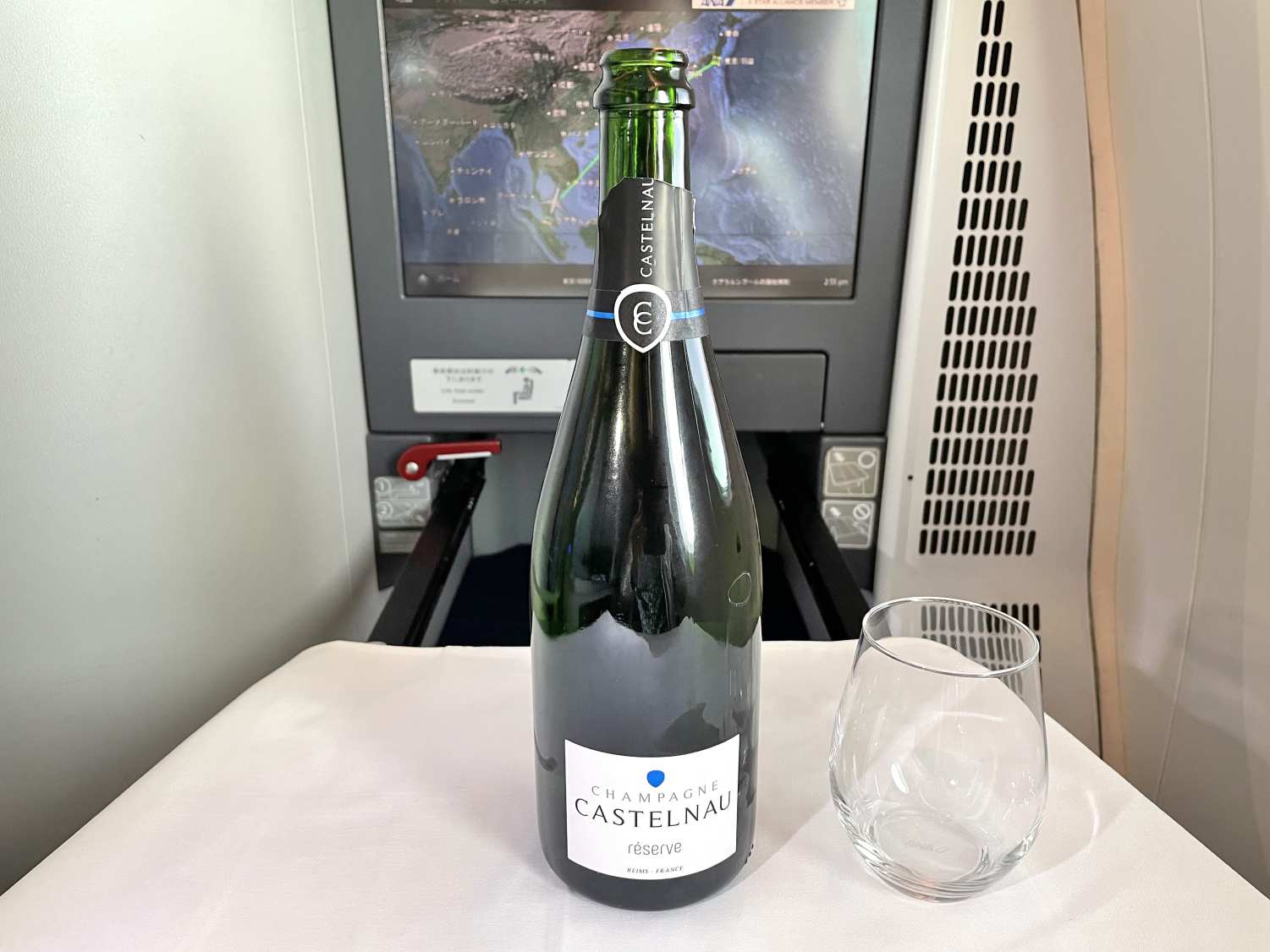 シャンパンは「CASTELNAU」。往路で飲んだドラピエとはまた違う初体験の銘柄です。