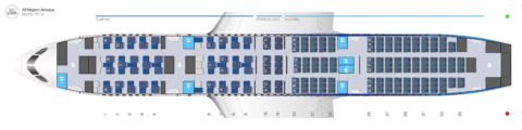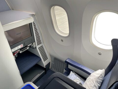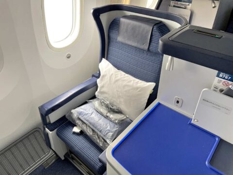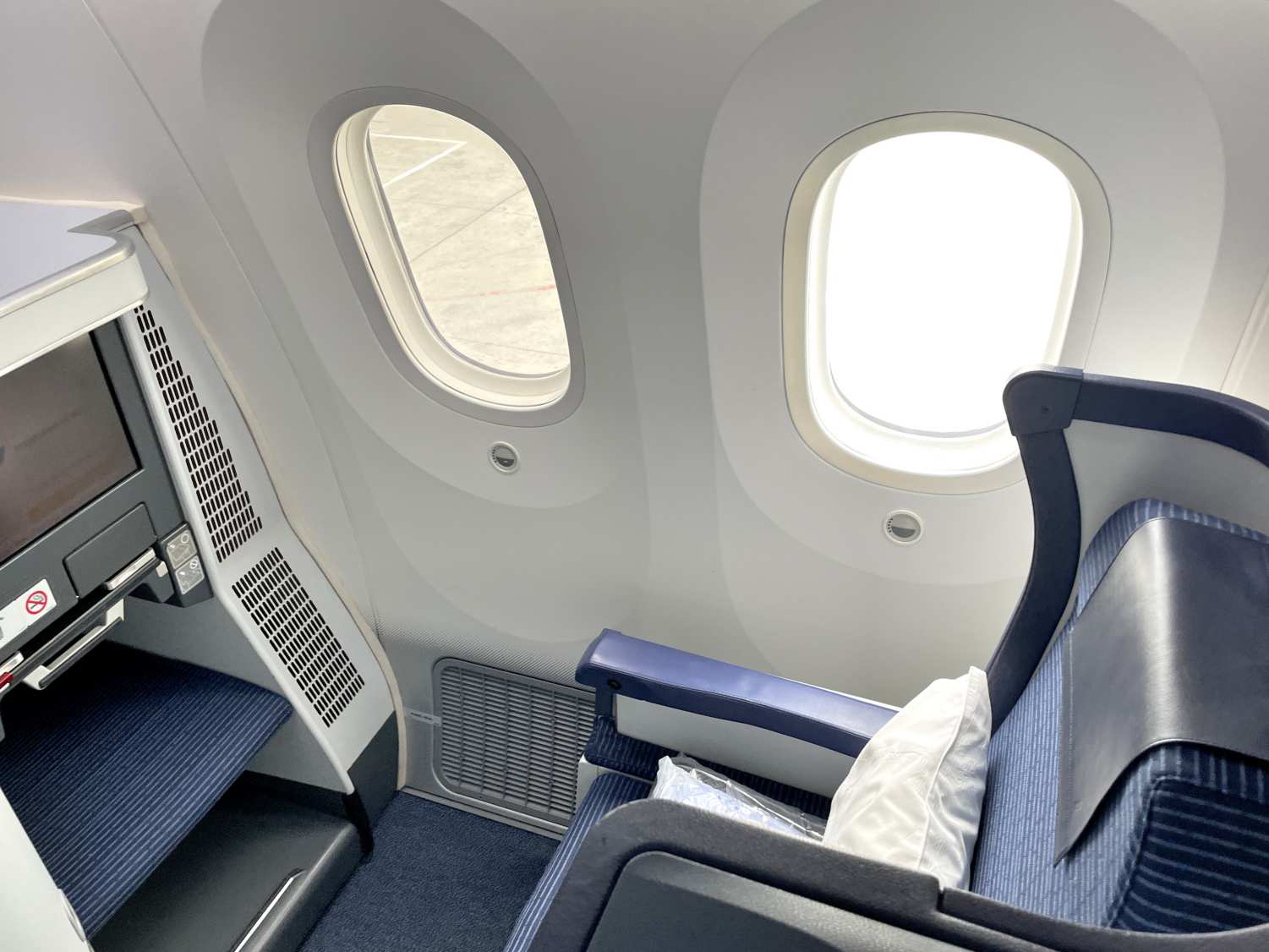 さてさて、今回の機材はB787-8。ビジネスクラスはよくあるスタッガードタイプですが、偶数列の中央席(F)に限っては両側にサイドテーブルを備えるという、ちょっと珍しい配列になっています。