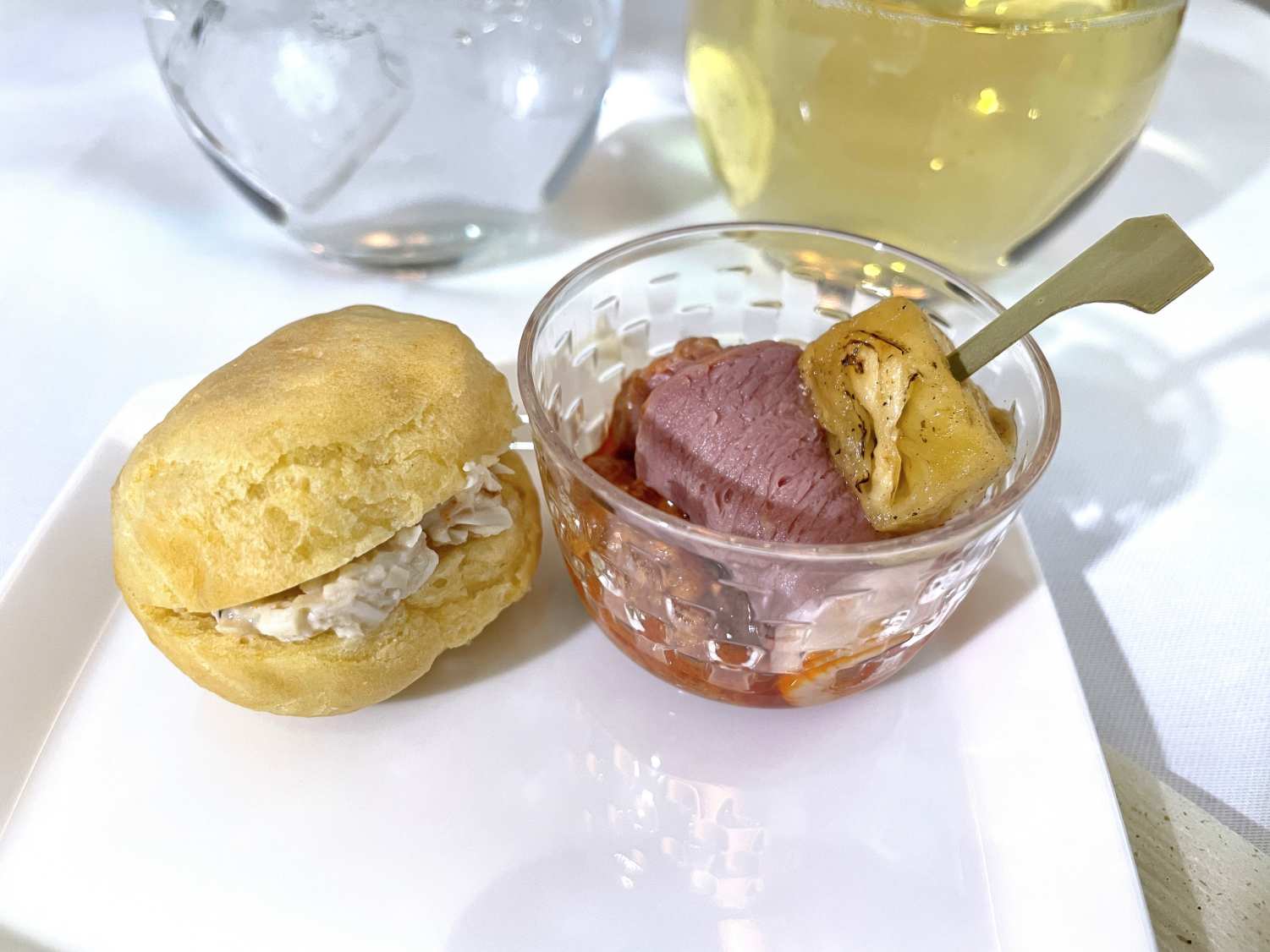 ただ、アミューズとして出てきたプロフィットロール(プチシュー)は生地がパサついて全然美味しくない…。ANAのアミューズはいつもレベルが高いので期待していたのに、これはちょっと頂けないな…。