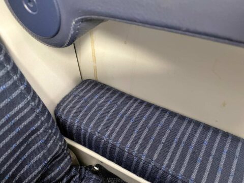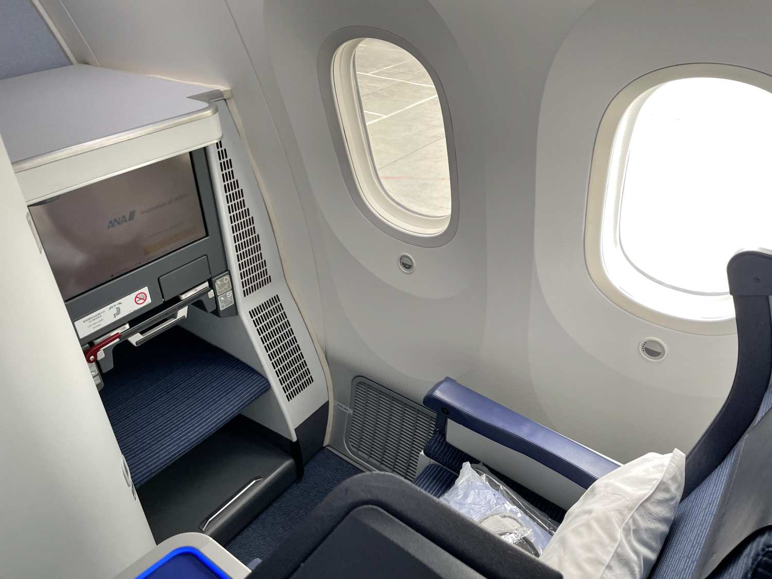 私の席は窓側の最前列1K。ここは前方に物を置ける(離着陸時はNG)スペースのあるオトクなお席ではあるのですが、同時に薄暗さと圧迫感があるので好みの分かれる所。