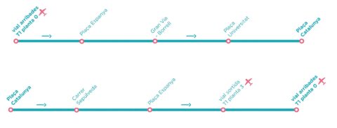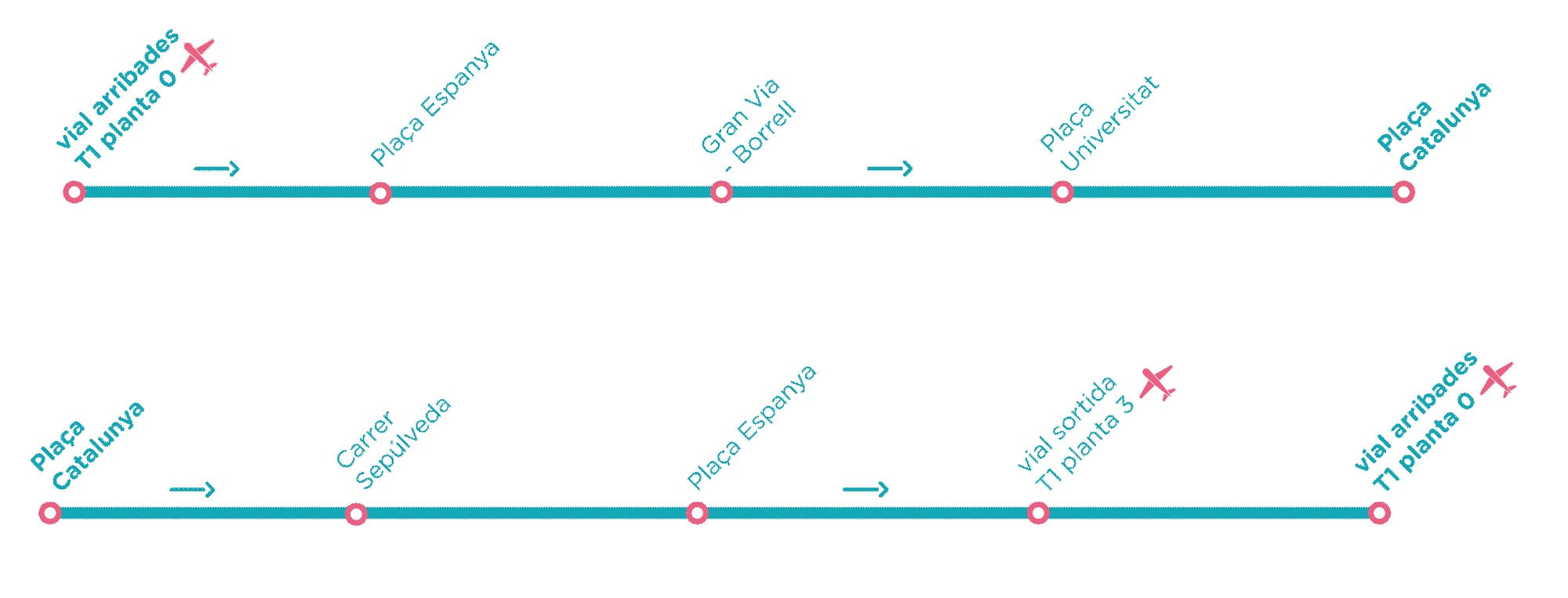 このAerobusの停留所ですが、終点のカタルーニャ広場(Pl.Catalunya)以外にもエスパーニャ広場(Pl.Espanya)など幾つか停留所がありますが、市内行きと空港行きで停留所が異なるので注意が必要。
