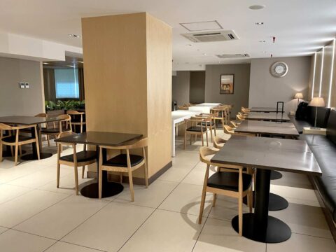続いて、通路を進んだ先にあるのがビュッフェ&ダイニングエリア。ここもスペースはかなり限られていますが、座席数はそれなりに多く確保されている模様。
