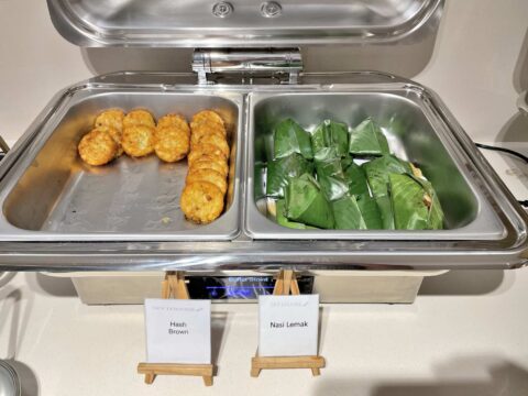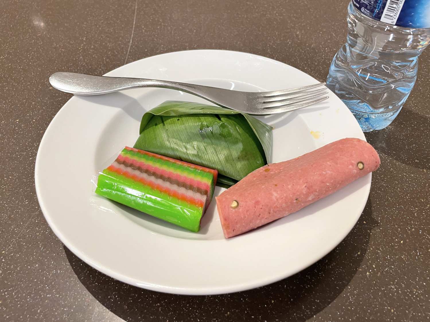 この後にビジネスクラスの機内食が控えている為あまり食べられませんでしたが、味は上々!とくにこのリーフに包まれたNasi Lemakは、ココナッツ風味に甘辛い味付けもあって美味!