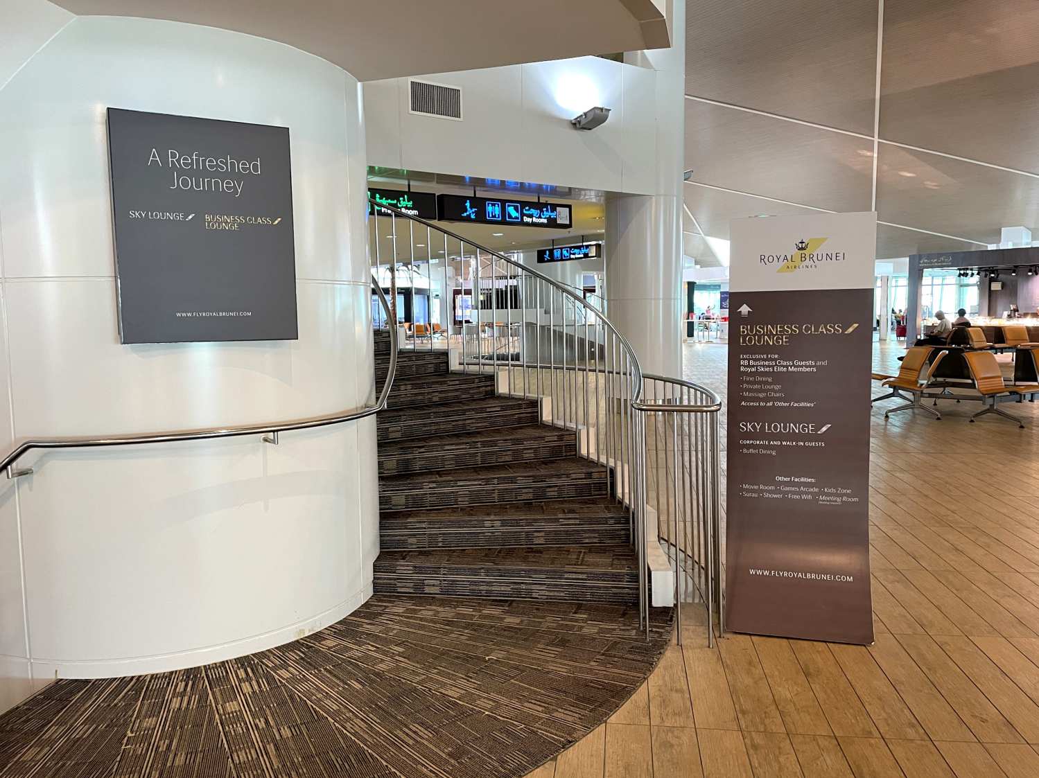 ブルネイ国際空港のスカイラウンジ、場所は制限区域内の上階(一つ上の階)にあって、出発ゲートのあるエリア中央の螺旋階段を上がった所にレセプションがあります。