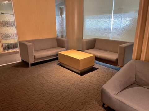 ここはラウンジ内のどこよりも天井が低い所ですが、シート同士のピッチも広く人の出入りも少ないので、ここが一番落ち着きます。ソファーの仕様もここだけは特別で、ドカっと座れる幅の広い玉座はゆったり寛げて良いです。