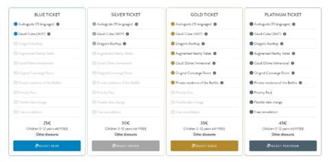 チケットには複数の種類があり、価格によって立ち入り可能な部屋や入場時のファストレーン使用可否が変わります。