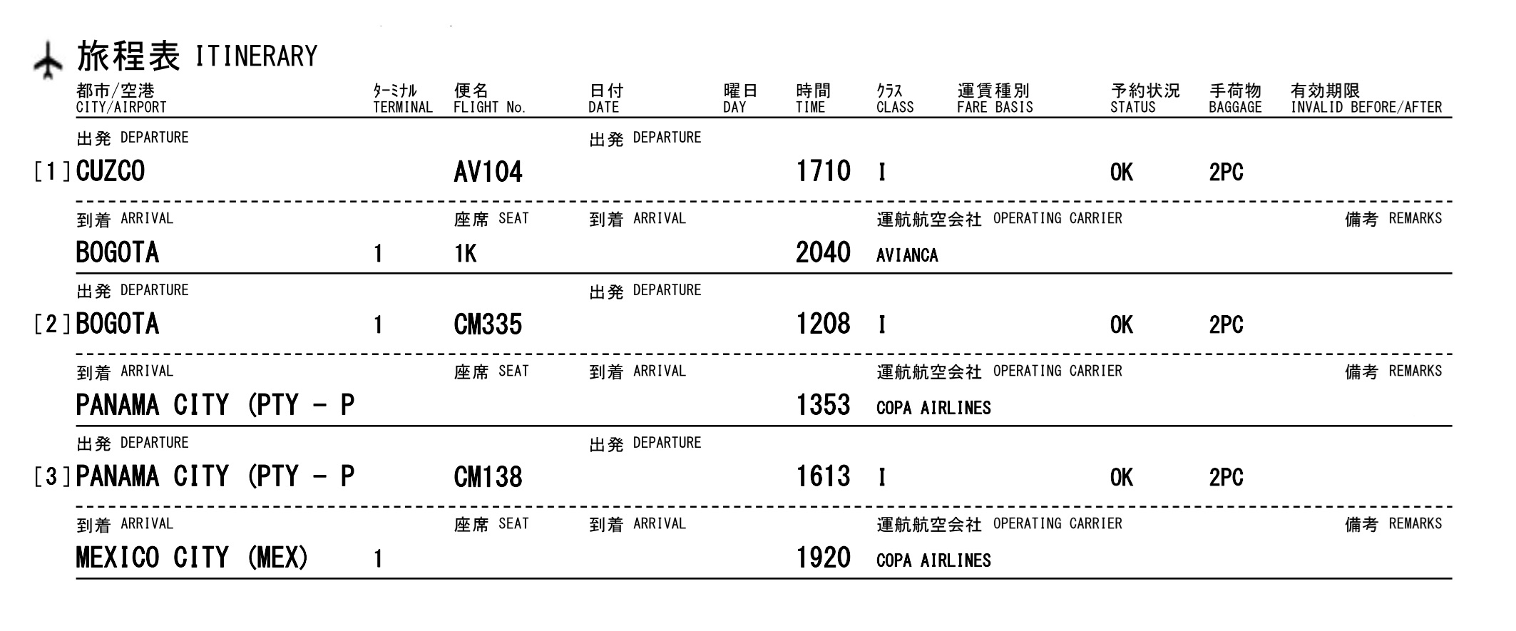 残る中米の区間はANAマイルで別途手配したAvianca航空とCopa航空。クスコからボゴタ(コロンビア)→パナマシティ→メキシコシティの計3区間、全てビジネスクラスで消費ANAマイルは48,000でした。