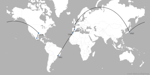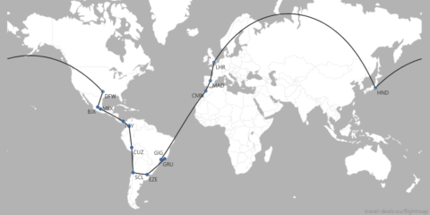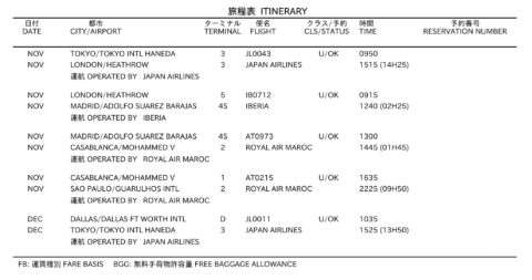 私が発券したルートがコチラ!東京・羽田からスタートし、ロンドン→マドリード→カサブランカ→サンパウロと飛んで南米へ到達。サンパウロから先は地上移動区間(行程内で1回限り)を入れ、最後はグアナファト(メキシコ)から再開してダラス・フォートワース→羽田へと帰着。