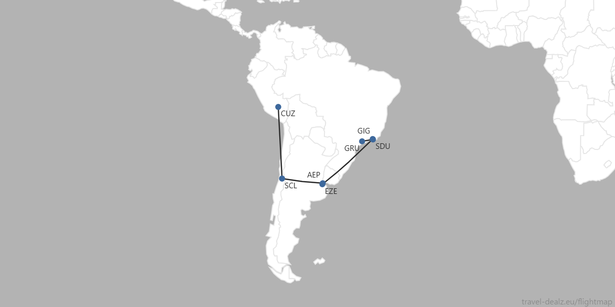 サンパウロからグアナファトまでの〈地上移動区間〉の内、南米はLATAM航空を使って計4区間:サンパウロ→リオデジャネイロ→ブエノスアイレス→サンティアゴ→クスコ(ペルー)の行程で飛びます。