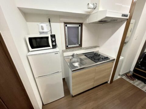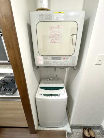 キッチンに冷凍・冷蔵庫、電子レンジに加え、洗濯・乾燥機も完備!洗剤や食器類は無いので自分で、利用の際は自分で揃える必要があります。