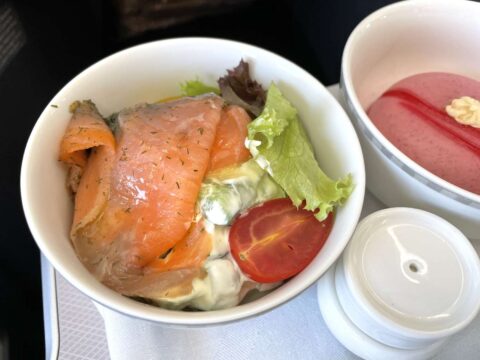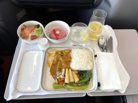 機内食は、ベルトサイン消灯後すぐにサーブされました。長距離路線ではないので、コースではなくワンプレートでの提供です。