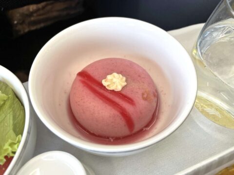 デザートは濃厚なイチゴのムースですが、アジア系のエアラインにありがちなしつこさも無く、こちらもとても美味しく頂きました!