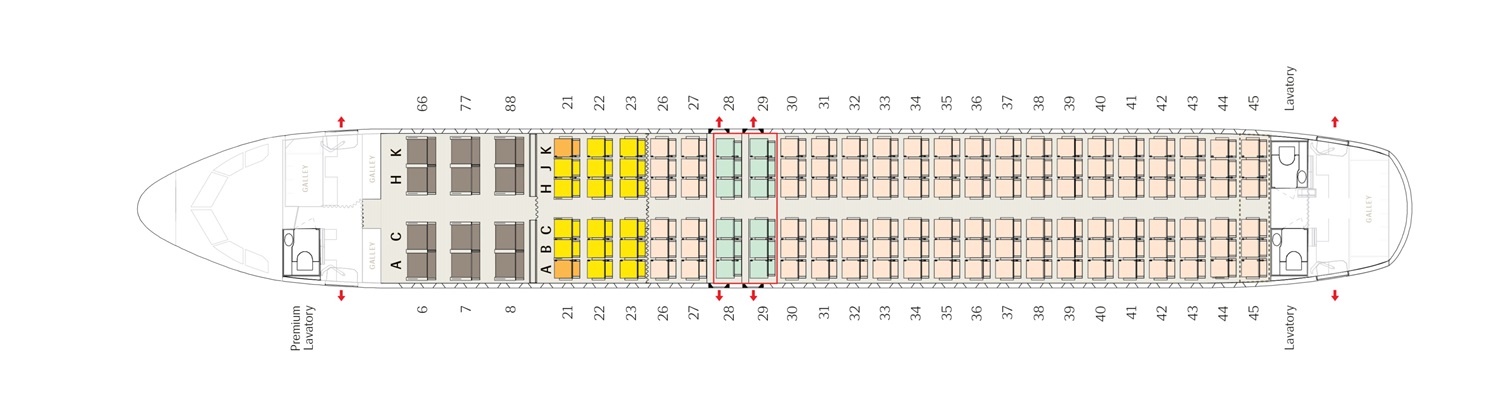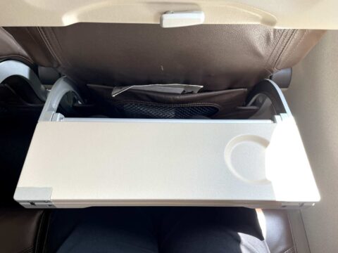 前後のピッチもエコノミークラスとしては標準的。ここ以外で足元の広い非常口座席が2列ありますが、見た感じピッチは殆ど変わらないですし、ひじ掛け式テーブル仕様で座席幅を圧迫するので、あまり選択する価値は無いかもしれません。