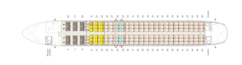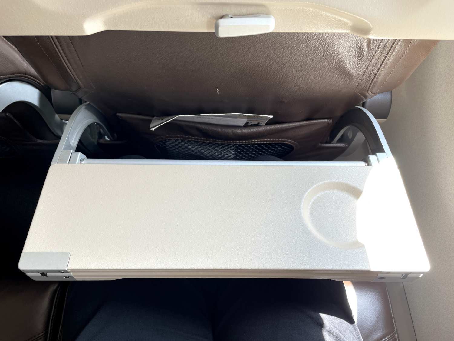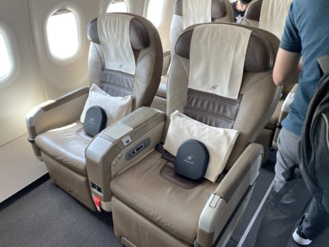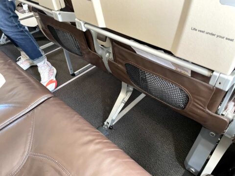 そしてこちらがエコノミークラス。ビジネスと同様の色合いで重々しく感じますが、座ってみるとそれほど窮屈感は無く、座席幅(ひじ掛け間)は目方で測って46㎝。