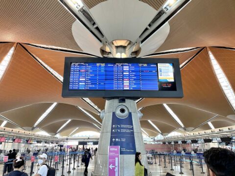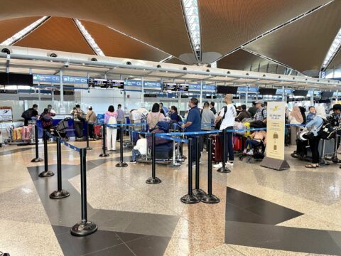 この時稼働していたカウンターはエコノミーが2つ、ビジネスクラスが1つ、オンラインチェックイン専用の手荷物預けレーンが1つの計4つ。何故かオンラインチェックインの所が最も行列が長く、これなら普通にここでチェックインするのが賢明でしょう。