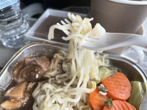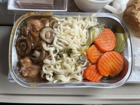 そしてこれが問題の機内食…。メニューはフィッシュカリー、チキンなんとか、エッグヌードルの3択なのですが、後方の席を選んでしまったが為に前2種類は既に品切れとの事。