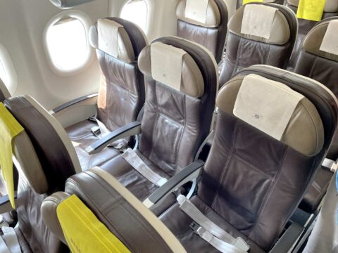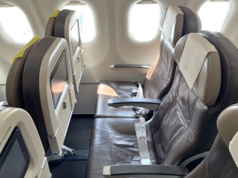 ビジネスクラスは2×2の3列配置で計12席。短距離向けとしては一般体な革張りシートです。