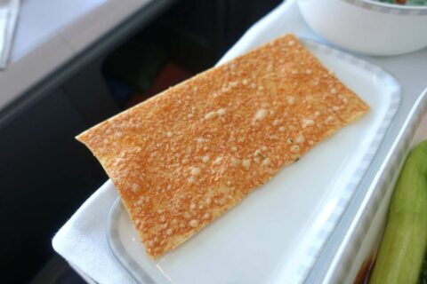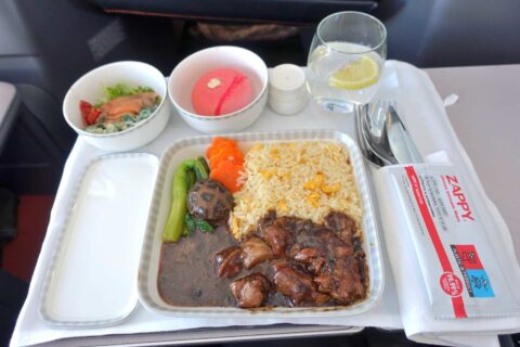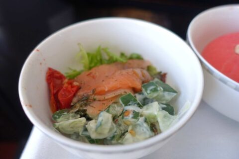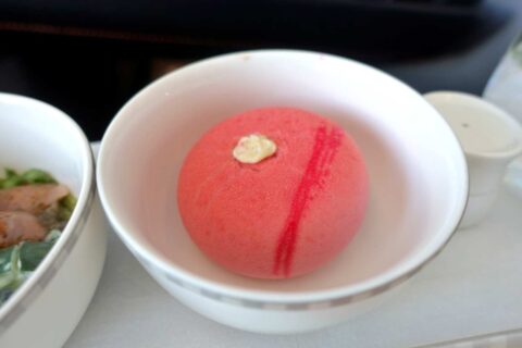 せめてデザートくらい違うものが食べたかったですが、でもねっとりと質の高いサーモン、濃厚なイチゴのムース、どちらも味は申し分ないのは流石5つ星エアラインと言ったところ。