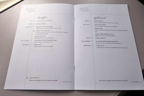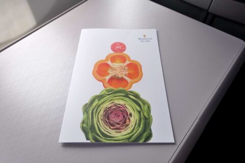 さてさて、離陸後すぐに機内食サービス開始!配られたメニュー表は、シンガポール航空お馴染みの野菜柄です。