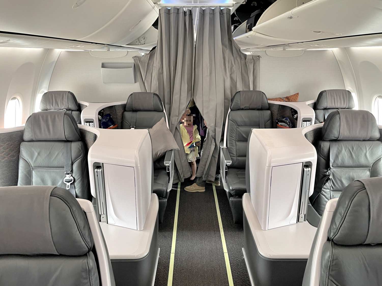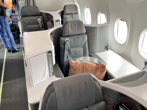 ビジネスクラスは3列で合計10席、その中でも2列目に限っては両隣にサイドテーブルを備えるキングシートです!