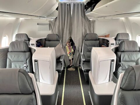 この便はB737-Max8という短距離向けの機材なのですが、このビジネスクラスがとにかく凄い!小型機にも関わらず、シートは長距離路線と同じフルフラットになる特別仕様!